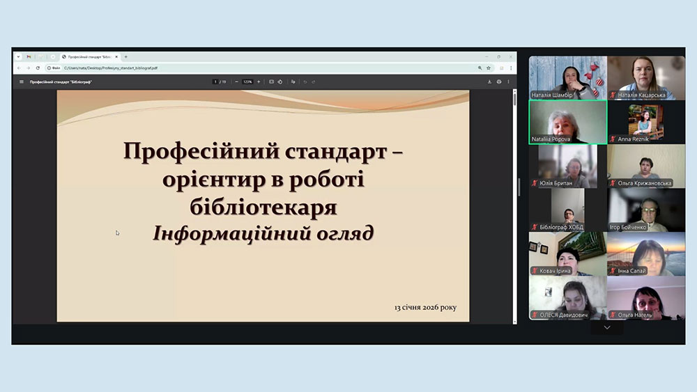 Розпочалася робота заходу з виступу Наталії Попової, головного методиста Херсонської обласної бібліотеки для дітей імені Дніпрової Чайки – «Професійний стандарт – орієнтир в роботі бібліотекаря». Спікерка презентувала нещодавно затверджений стандарт «Бібліограф», який став завершальним етапом масштабного оновлення професійних вимог у бібліотечній сфері після двох попередніх професійних стандартів та розповіла колегам, що має на меті стандарт «Бібліограф», його ключові аспекти, короткий опис трудових функції. А підготовлений Ганною Новицькою, завідувачкою інформаційно-бібліографічного відділу бібліотеки, презентаційний матеріал розкривав, які знання, навички та комунікація відповідають певній трудовій функції.