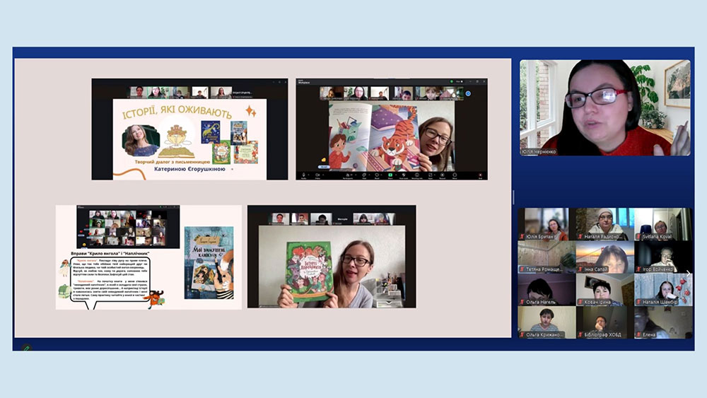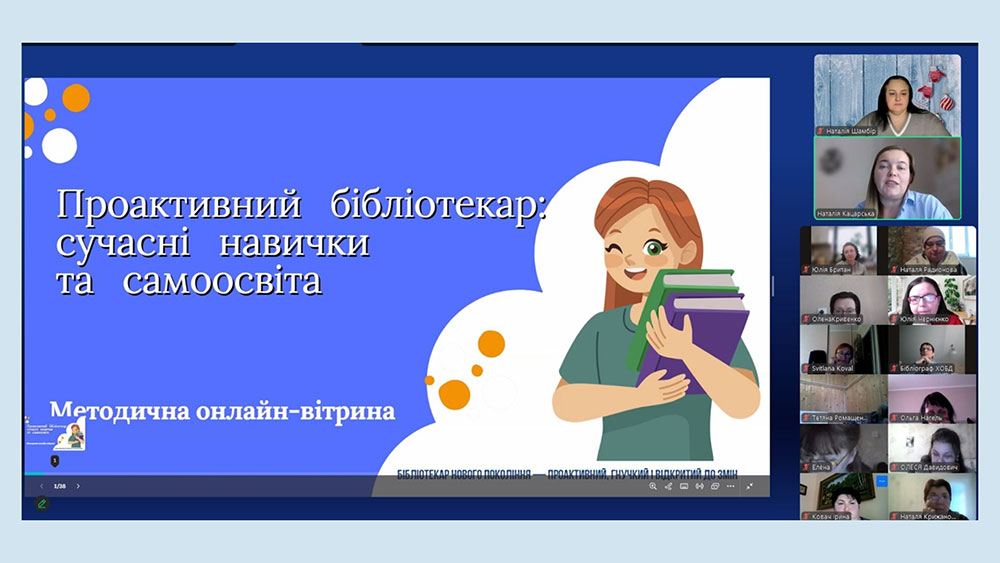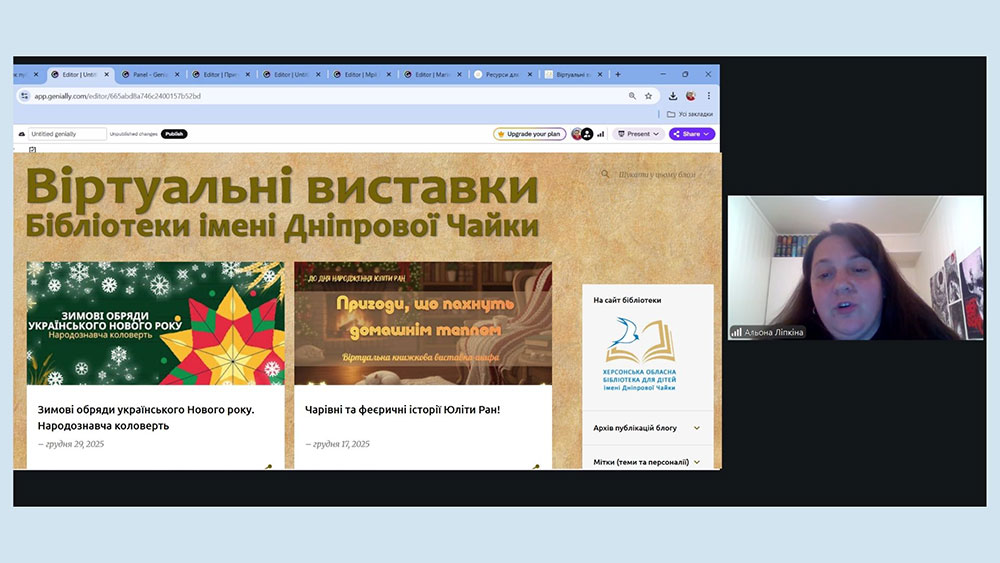 На завершення програми для бібліотечних працівників закладів загальної середньої освіти Херсонської області було проведено медіа-майстерку «Genially – платформа для створення віртуальних книжкових виставок» від Альони Ліпкіної, головної бібліотекарки сектору абонемента Бібліотеки імені Дніпрової Чайки.