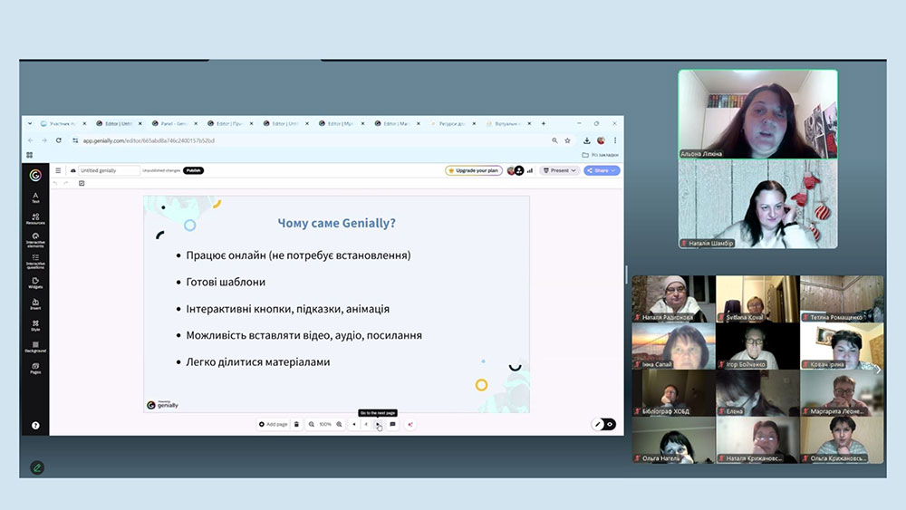 Спікерка розповіла про особливості та переваги мультизадачного онлайн-сервісу, який містить понад тисячу різноманітних шаблонів, за допомогою яких можна швидко і без зайвих зусиль створювати інтерактивний контент, а бібліотеці – бути інтерактивною, сучасною та доступною онлайн. Так, демонструючи власні розробки літературних вікторин, квестів, віртуальних виставок, інтерактивних презентацій, тренерка дала покрокову інструкцію, як легко створити власну авторську розробку на даній платформі.